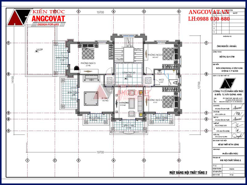 +) Tầng 2: ban công 12m2; sảnh chung 27m2; Phòng thờ 12,6m2; Phòng ngủ 3 12,5m2; Phòng ngủ 4 17,3m3; Phòng ngủ 5 12,5m2; Phòng giặt 9,1m2; WC2 6m2.