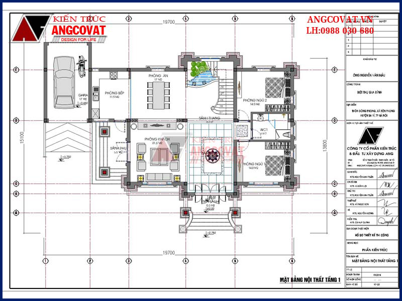 +) Tầng 1: Tiền sảnh chính: 17m2, Sảnh trung tâm: 24.7m2, Không gian thờ: 23m2, Phòng khách 26.7m2, Sảnh phụ 4.5m2, WC2: 5m2, Phòng bếp ăn: 33.7m2, Sảnh phụ 3.5m2, Phòng ngủ master: 20.7m2, Phòng thay đồ: 12.2m2, Phòng WC1: 13.1m2, gara ô tô: 34m2