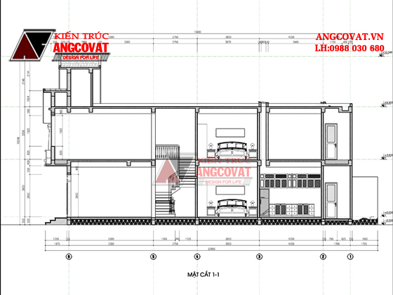 Nhìn vào mặt cắt 1-1 bạn có thể thấy được toàn bộ các bố trí nội thất các phòng cũng như cách thiết kế khu vực cầu thang để bạn có cái nhìn tổng quan và hình dung dễ dàng hơn.