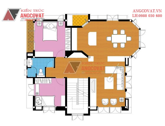 Mặt bằng tầng 2 cuả mẫu biệt thự 3 tầng 100m2 phong cách hiện đại bao gồm 1 phòng khách, 2 phòng ngủ và 1 phòng sính hoạt chung. Phòng khách của mẫu thiết kế nhà đẹp 100m2 được thiết kế theo dáng hình đa giác với nhiều cửa sổ kính được thiết kế theo hướng mở rộng không gian. Phòng khách được trang bị bộ bàn ghế gỗ lớn là nơi gia chủ đón tiếp các vị khách quý. Hơn nữa không gian phòng còn được đặt gần cửa sổ nhằm mang đến cảm giác thoải mái, thư giãn dành cho gia chủ.