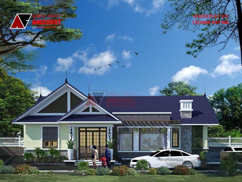 Thiết kế biệt thự trệt mái thái 4 phòng ngủ độc đáo với hệ thống mái xếp chồng màu xanh mát mẻ, hấp dẫn người nhìn. Không gian sống được trải dài và phát triển theo chiều ngang của ngôi nhà kiểu cấp 4 5 gian này