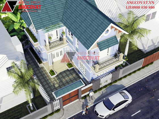 Khi nhìn mẫu biệt thự 2 tầng diện tích 70m2 từ trên xuống bạn sẽ cảm nhận đưuọc thiết kế mái thái tinh xảo được chúng tôi sử dụng để tôn lên vẻ đẹp của mẫu thiết kế này. Mái thái ngày nay được rất nhiều gia chủ lựa chọn bởi vẻ đẹp, ưu thế về chống nóng cũng như giá thành hợp lí. Hơn nữa phần mái thái có tone màu xanh đậm nổi bật trên tone màu chủ đạo còn gợi sự thu hút về tầm cao cho ngôi nhà 2 tầng 7x11.5m.