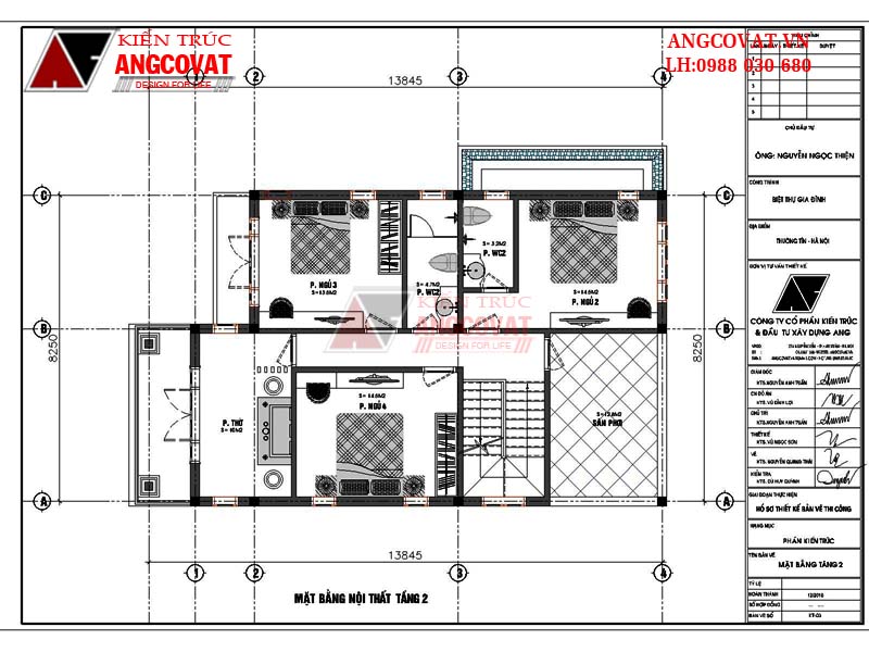 Tầng 2: ngủ 2 14.5m2, ngủ 3 13.5m2, ngủ 4 14.5m2, thờ 10m2, vệ sinh 2 4.7m2, vệ sinh 3 3.2m2, sân chơi 12.8m2