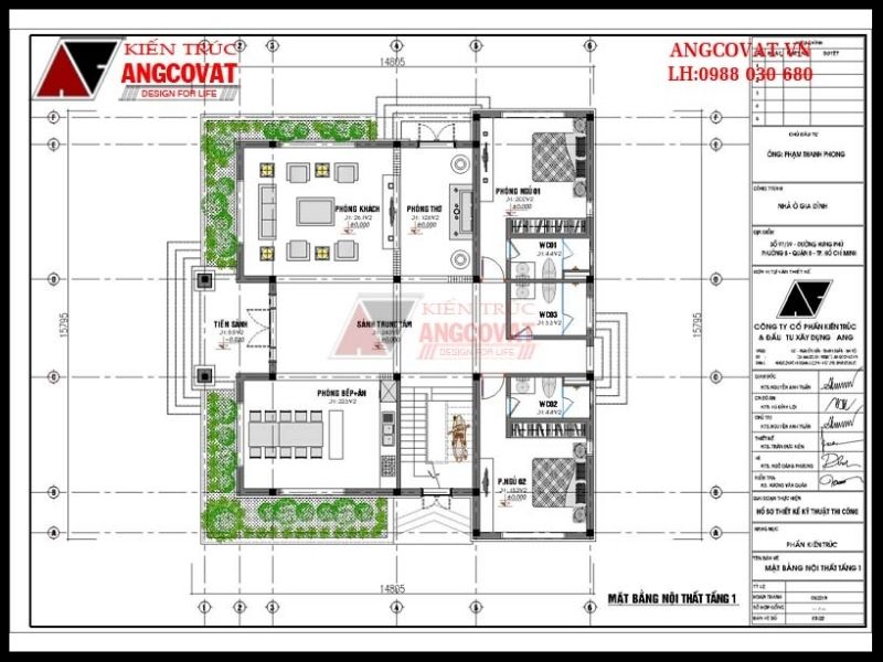 +) Tầng 1: Tiền sảnh: 8,8m2; sảnh trung tâm 24,3m2; phòng khách 26,1m2; Phòng thờ: 12,6m2; Phòng bếp và ăn: 22,5m2; Phòng ngủ 1: 20m2; WC1: 4,4m2; Phòng ngủ 2: 18,3m2; WC2: 4,4m2; WC3: 5,5m2.