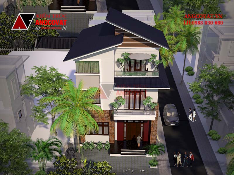 Hình ảnh mau thiet ke biet thu khi nghìn nghiêng và từ trên cao xuống bạn sẽ cảm thấy hệ thống mái lệch của ngôi nhà khá bắt mắt. Với màu đen của ngói hoàn toàn nổi bật trên tone màu chủ đạo đã mang đến cảm giác chắc khoẻ cho toàn bộ thiết kế.
